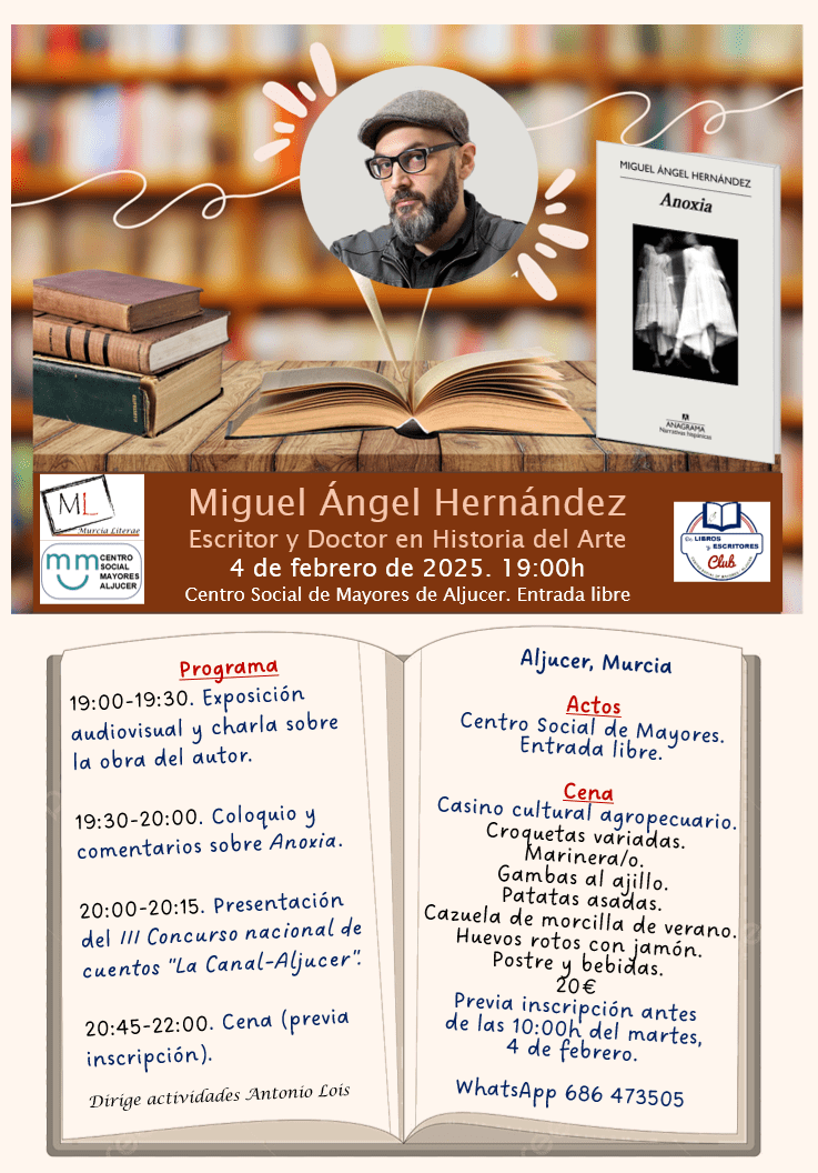 Narrativa, diarios, ensayos, ediciones… explorador poliédrico de temas sugerentes y fronterizos, como en Anoxia (Barcelona. Anagrama, 2023), Libro Murciano del año que los lectores en inglés ya pueden disfrutar gracias al trabajo de traducción de Adrian Nothan West. A ver qué nos cuentas los lectores de nuestro club que lo han leído y el autor, que algo tienen que ver… ya os contaremos.