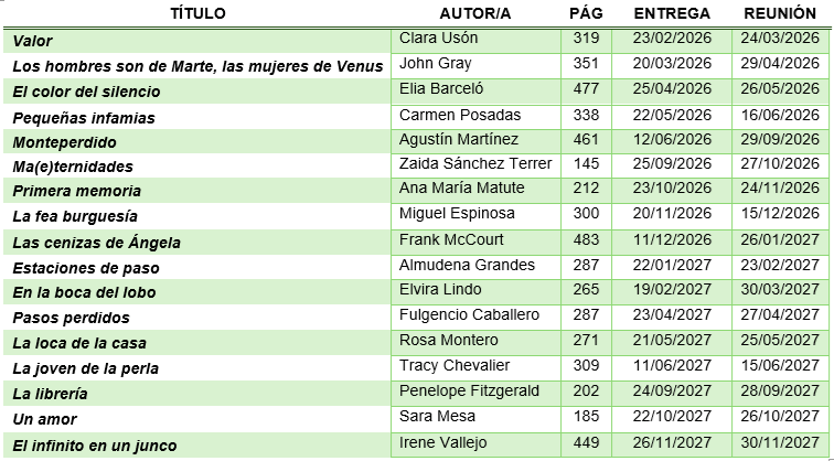 Estas son nuestras lecturas desde febrero de 2026 hasta noviembre de 2027, con las fechas de entrega a los lectores y los días de la reunión para comentar lo leído. En este periodo, esperamos que tres escritores acepten nuestra invitación para hablar del universo de los libros y de sus obras.